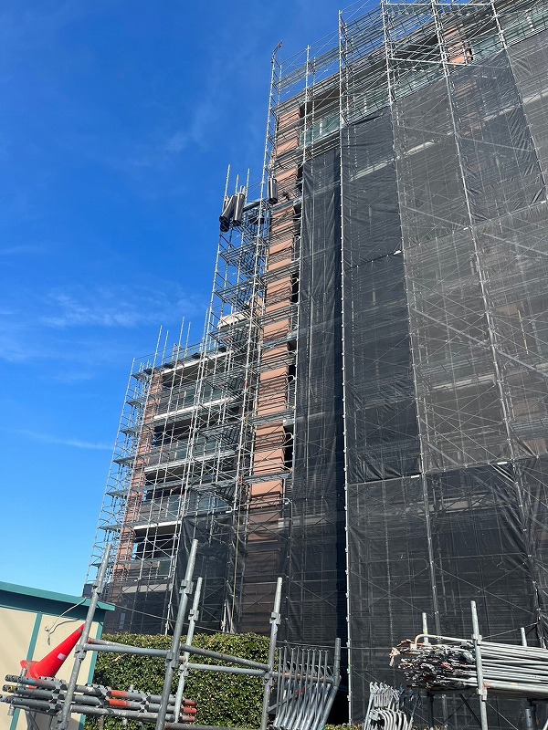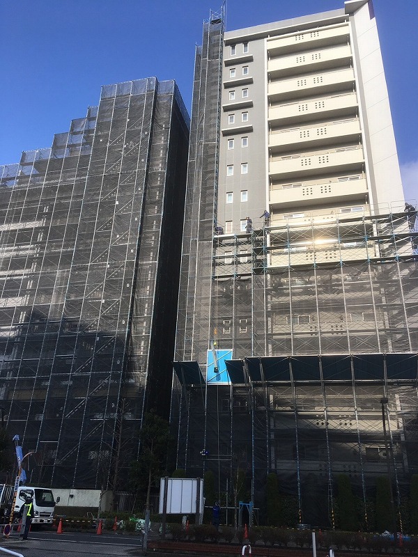 有限会社進和建設ではマンションの改修工事・大規模修繕工事などの際に足場を組み、メッシュシートを設置しています。